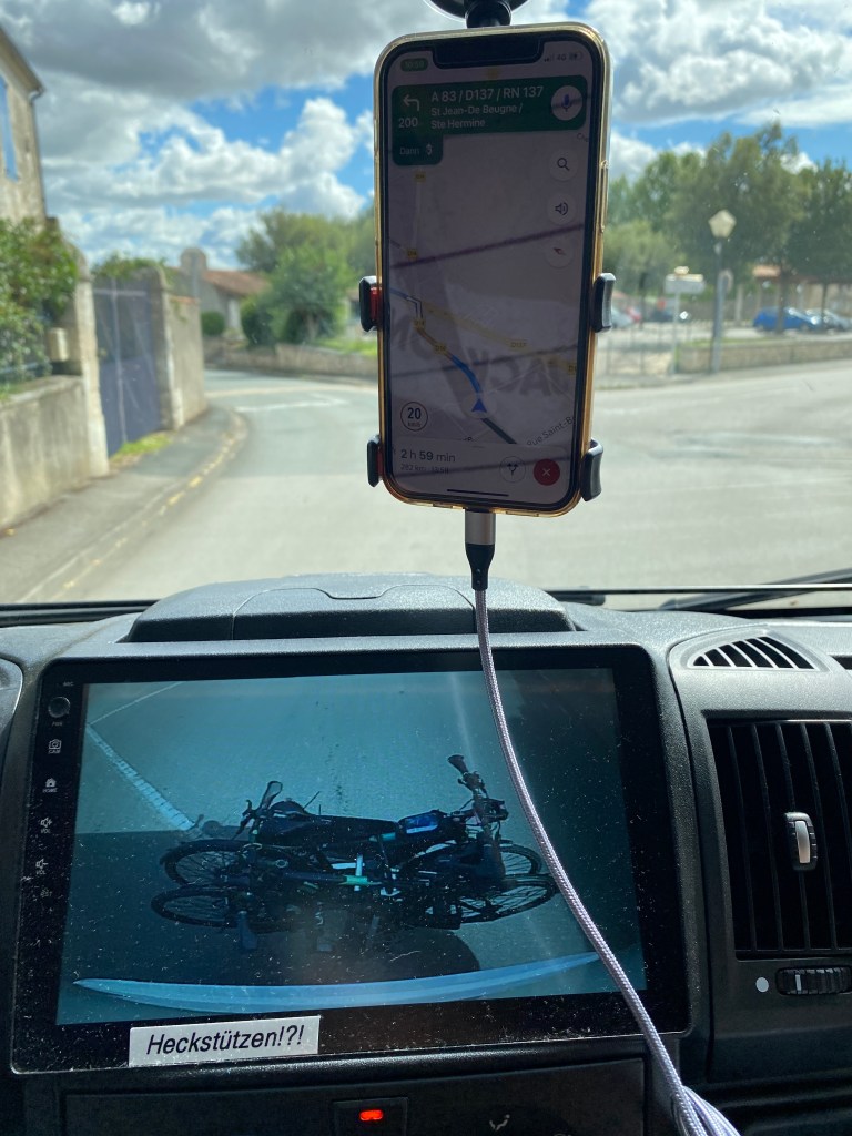 Am hinteren Teil unseres Womos hatten wir eine Kamera. So konnten wir immer unsere Räder sehen. Da sie auf einem Träger standen,der nur auf der Kupplung befestigt war, wackelte es oft. Wenn man über größere Huckel gefahren ist, verzog sich auch schon mal das ganze Teil… 😒