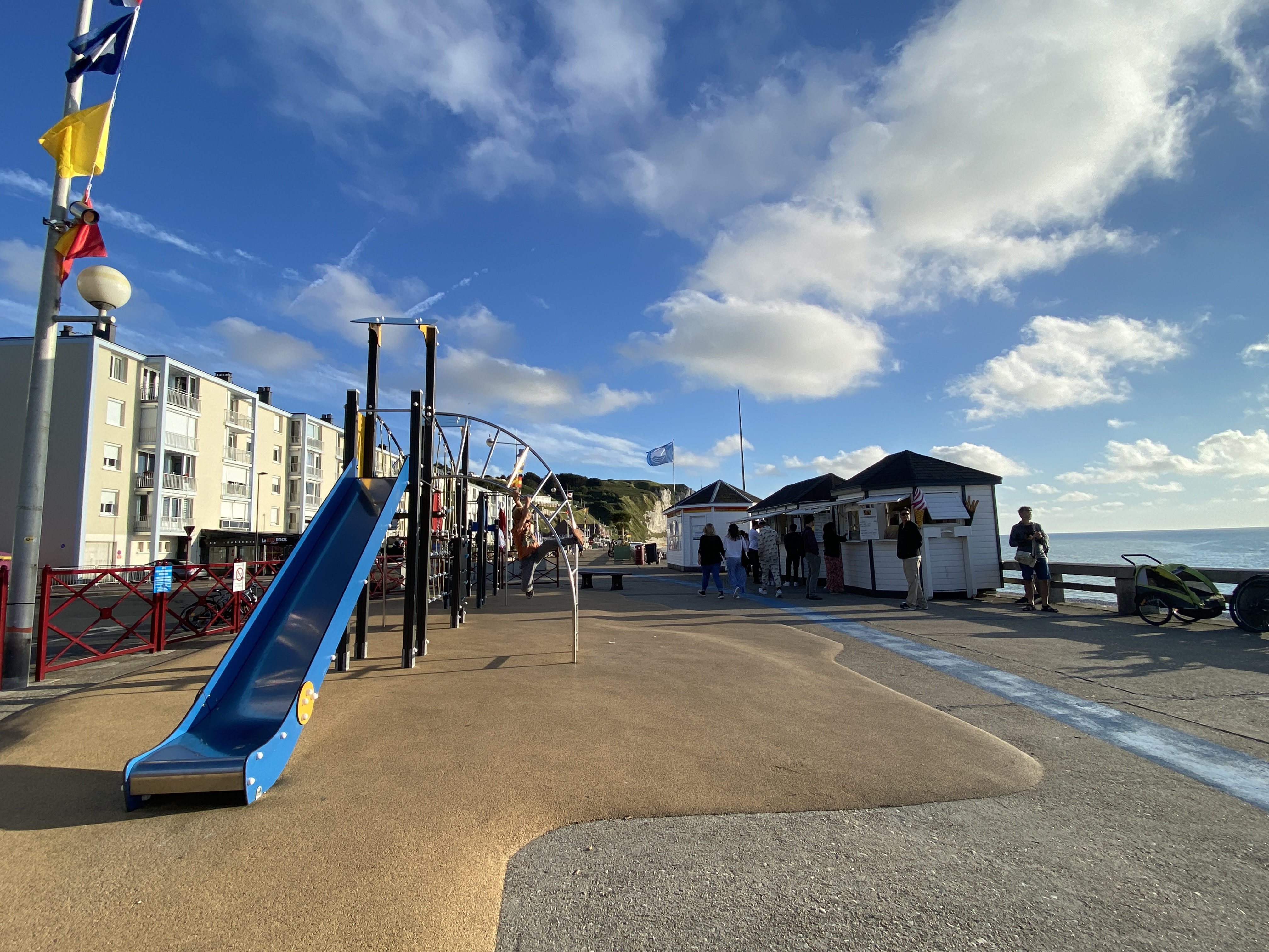 Dafür sind wir direkt nach Ankunft mit den Rädern runter nach Fécamp an den Steinstrand gefahren. Ziemlich große Steine gibt es hier. Da kann man nich gut Laufen und sich Hinlegen. Später gab es noch eine Kleinigkeit zu Essen und Vincent tobte sich noch auf den diversen Spielplätzen an der Strandpromenade aus 🙂